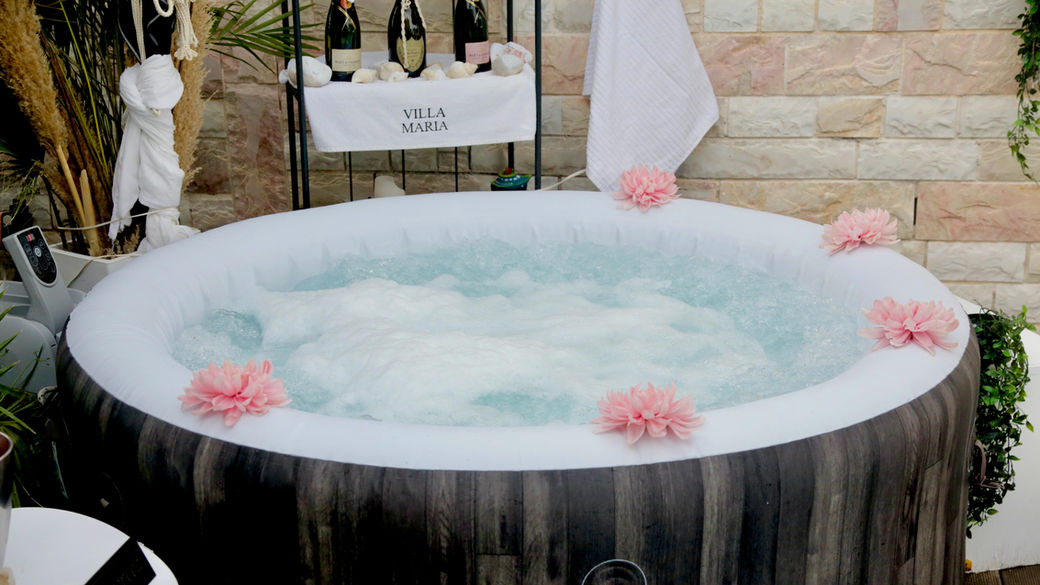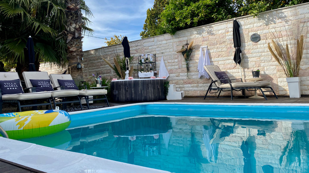 The Villa is located on the first floor (Upstairs) with the exclusive and private access to the Pool, Jacuzzi, Garden, Bar, Barbecue and all external amenities. The Villa boasts 3 double beds, and 2 Sofa Beds. The villa can hosts a maximum of 6 adults, 2 children, and one baby.